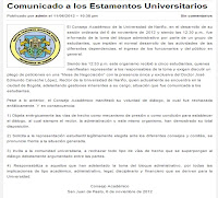 Los estudiantes permanecieron en el bloque y el 10 de noviembre el rector emite un comunicado de 3 páginas (lo puede ver aquí) donde hace unas consideraciones y en conclusión propone que: