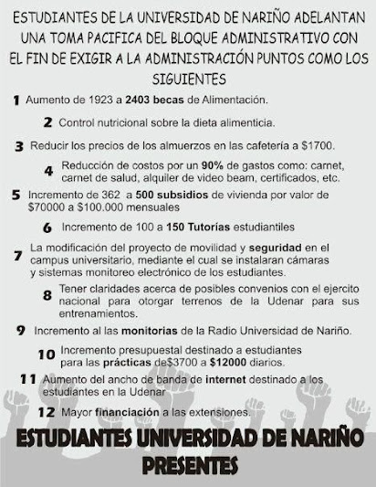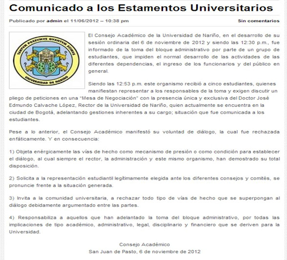 Un grupo de estudiantes pertenecientes a la Universidad de Nariño bajo el argumento de una crisis interna por la que atraviesa la universidad, desde el día 6 de noviembre de 2012 realizaron una toma al bloque administrativo de esta institución, realizaron la toma y presentaron una lista de 12 peticiones a través de un volante que fue repartido al interior de la universidad y que no tiene una firma concreta pero se identifica como “estudiantes de la Universidad de Nariño”